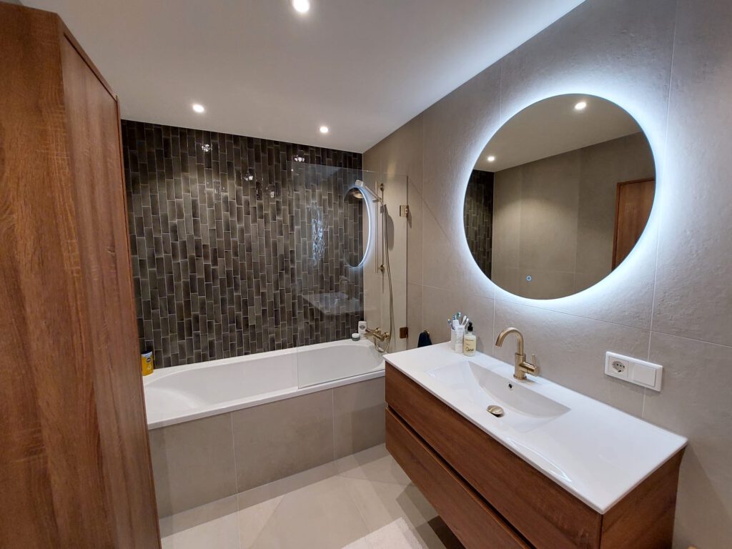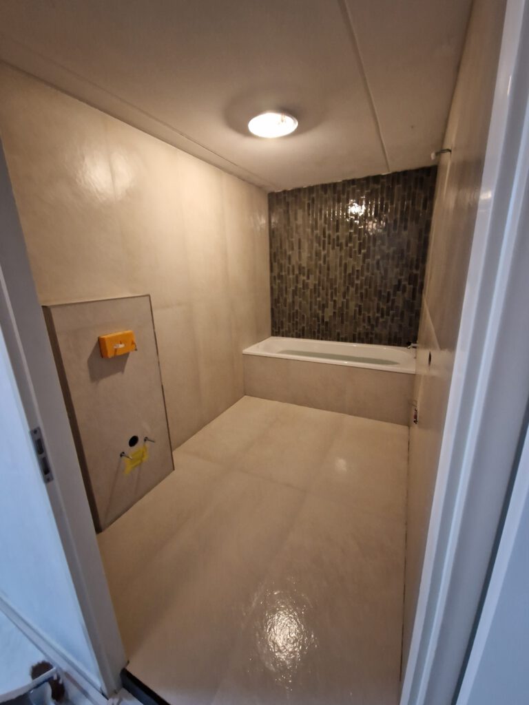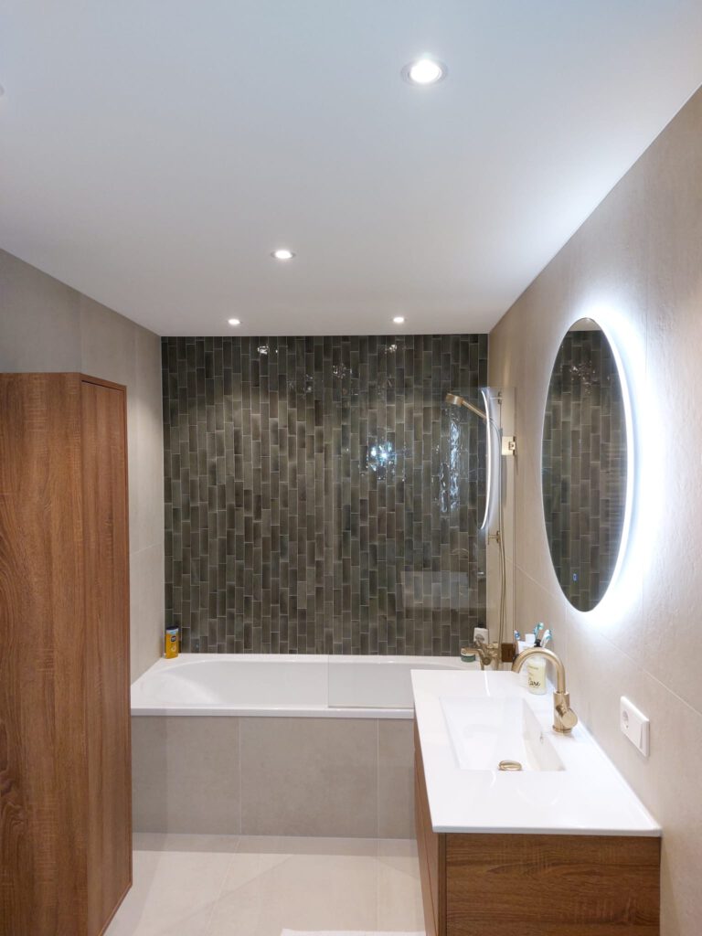 In deze badkamer is hoogwaardig tegelwerk uitgevoerd met een combinatie van grote, rustige wand- en vloertegels en een opvallende accentwand achter het bad met donkere, smalle tegels. Alle voegen en hoeken zijn strak en zorgvuldig afgewerkt. Daarnaast is de ruimte compleet afgewerkt met montage van sanitair, spiegels, verlichting en accessoires, voor een luxe en sfeervol eindresultaat.