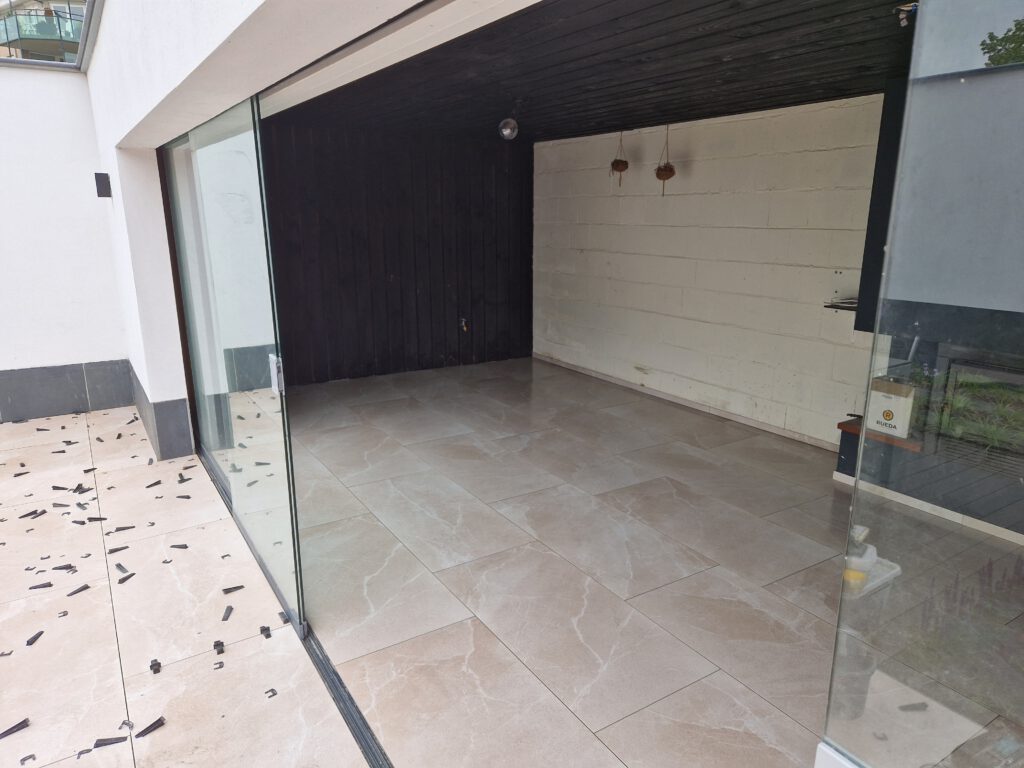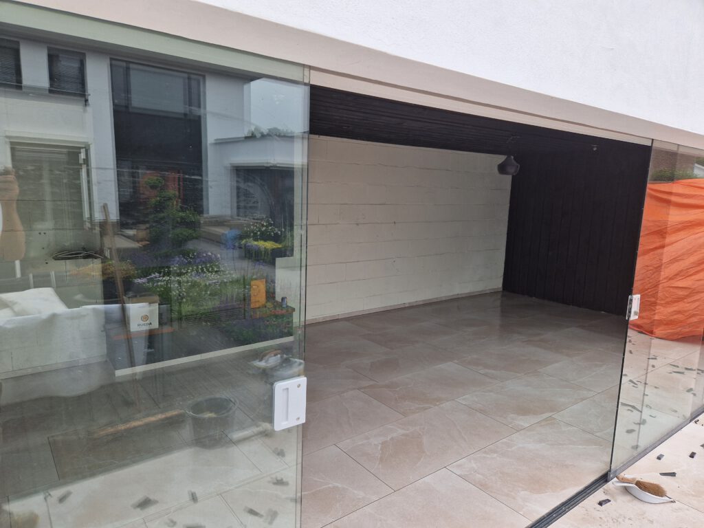 Voor dit project is een strakke, grootformaat vloertegel geplaatst in een lichte natuursteenlook, zowel binnen in de tuinkamer als doorlopend naar het terras buiten. De tegels zijn nauwkeurig gelegd met minimale voegen voor een modern en ruimtelijk effect. Overgangen naar de glazen schuifpui en muren zijn zorgvuldig afgewerkt, zodat binnen en buiten visueel één geheel vormen.